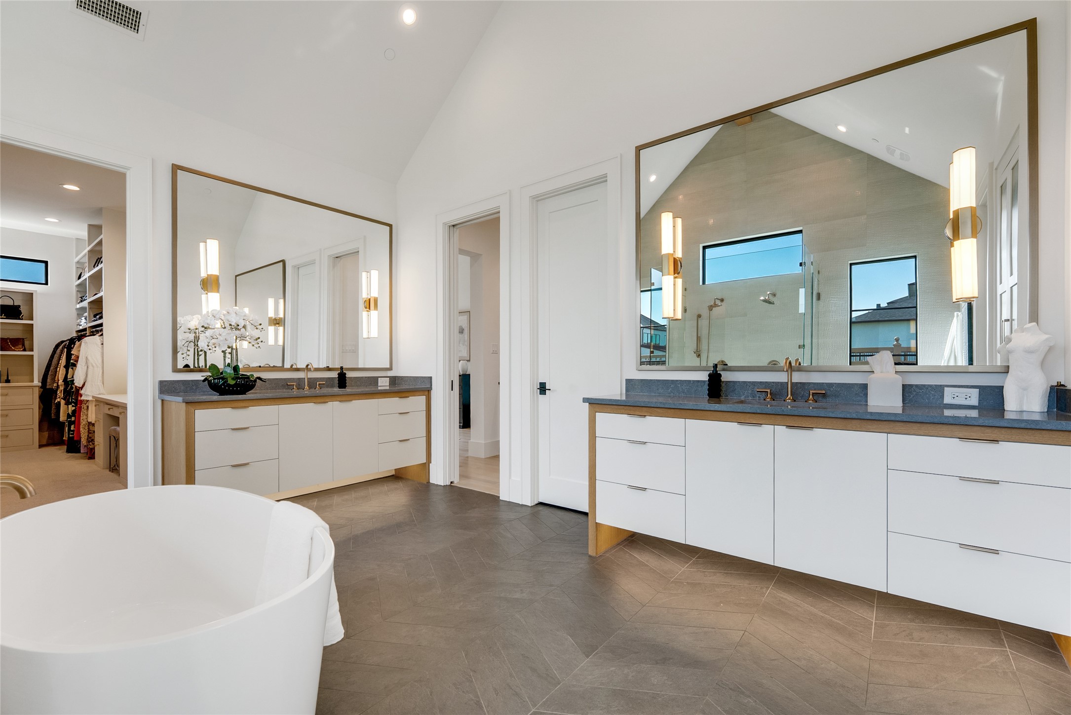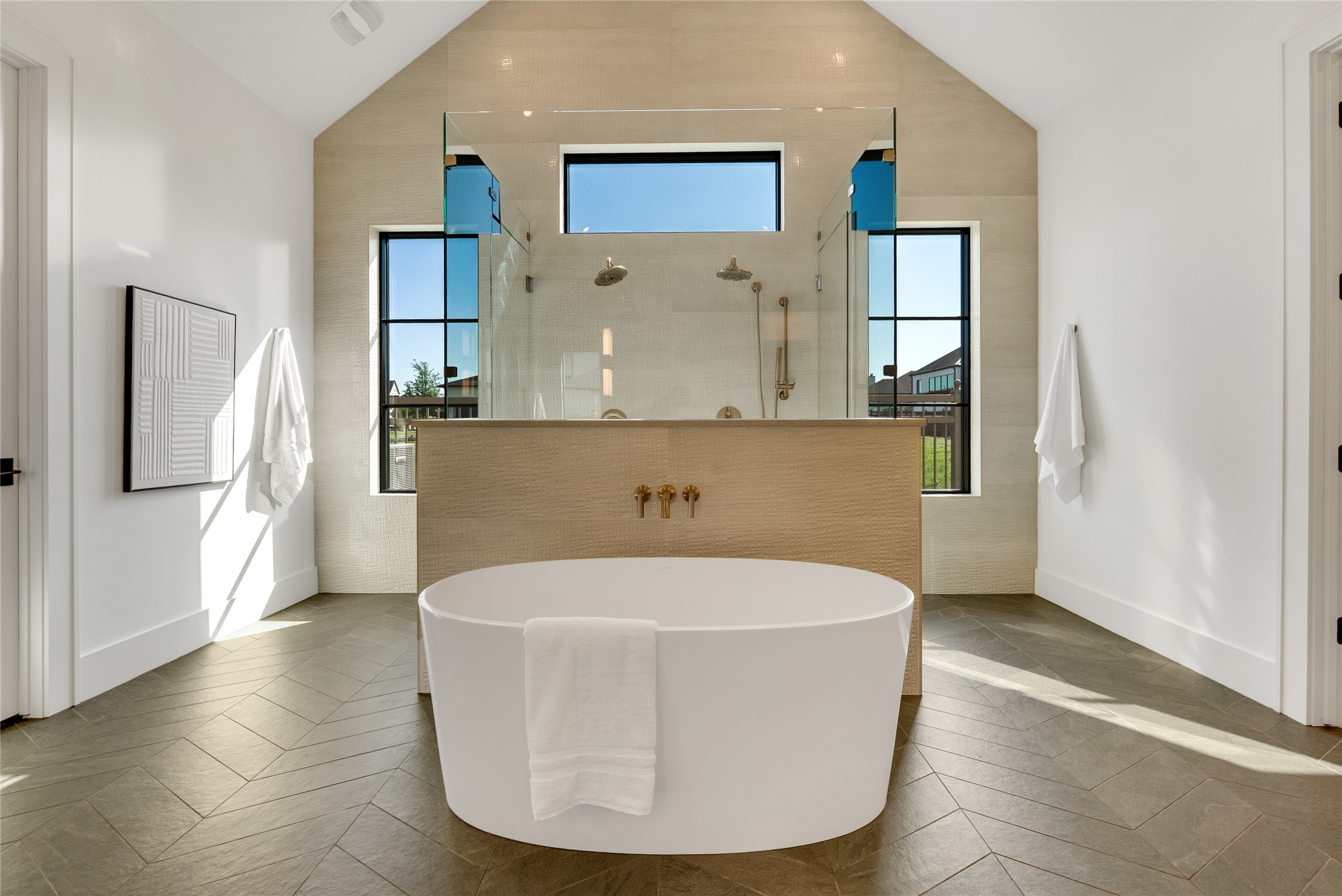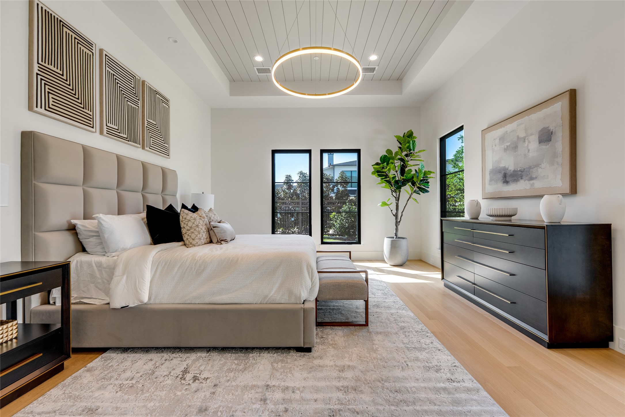 The serene primary suite is a sanctuary of its own, featuring a private coffee bar, spa-like bathroom with oversized shower and soaking tub, and dual custom closets designed for luxurious functionality.