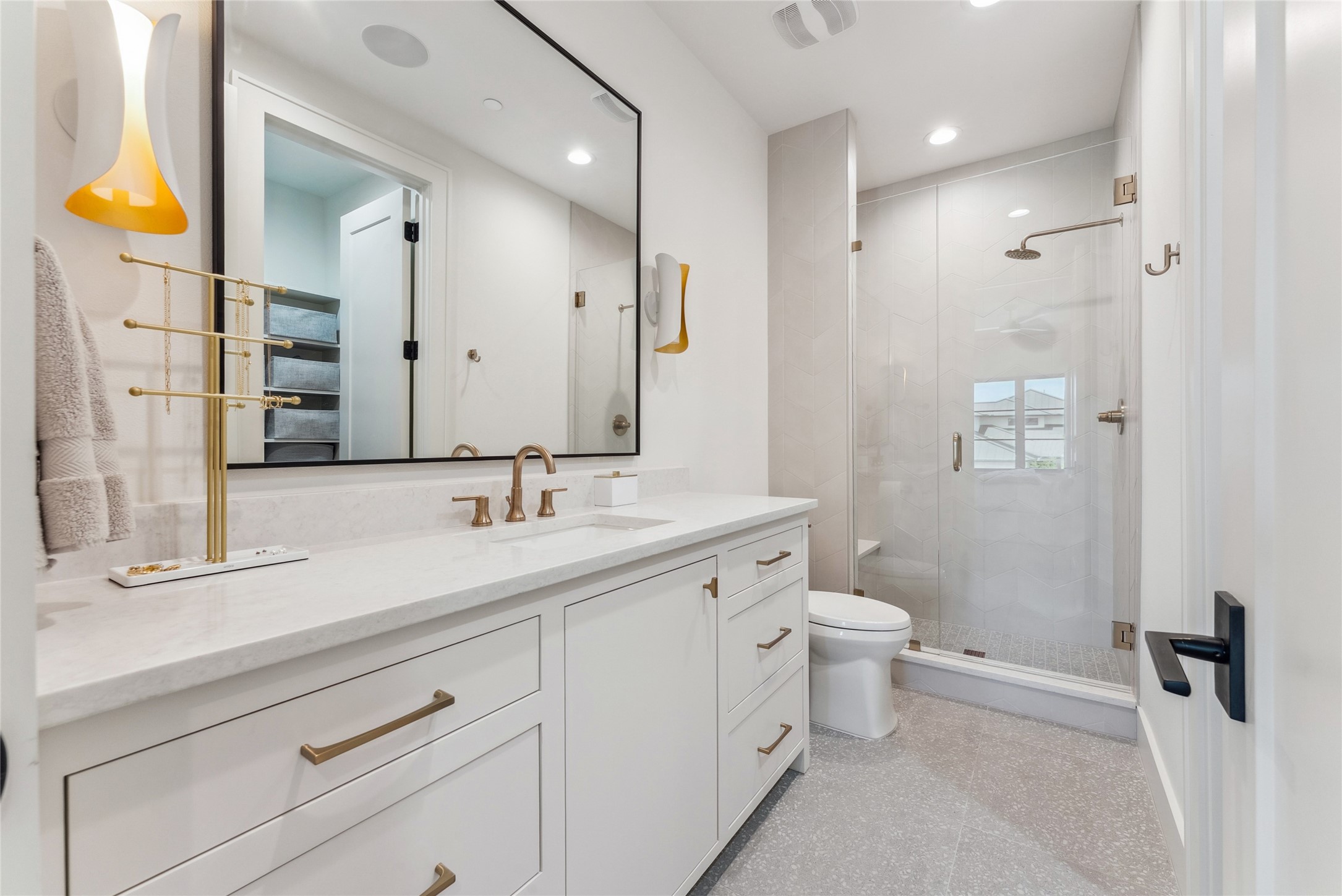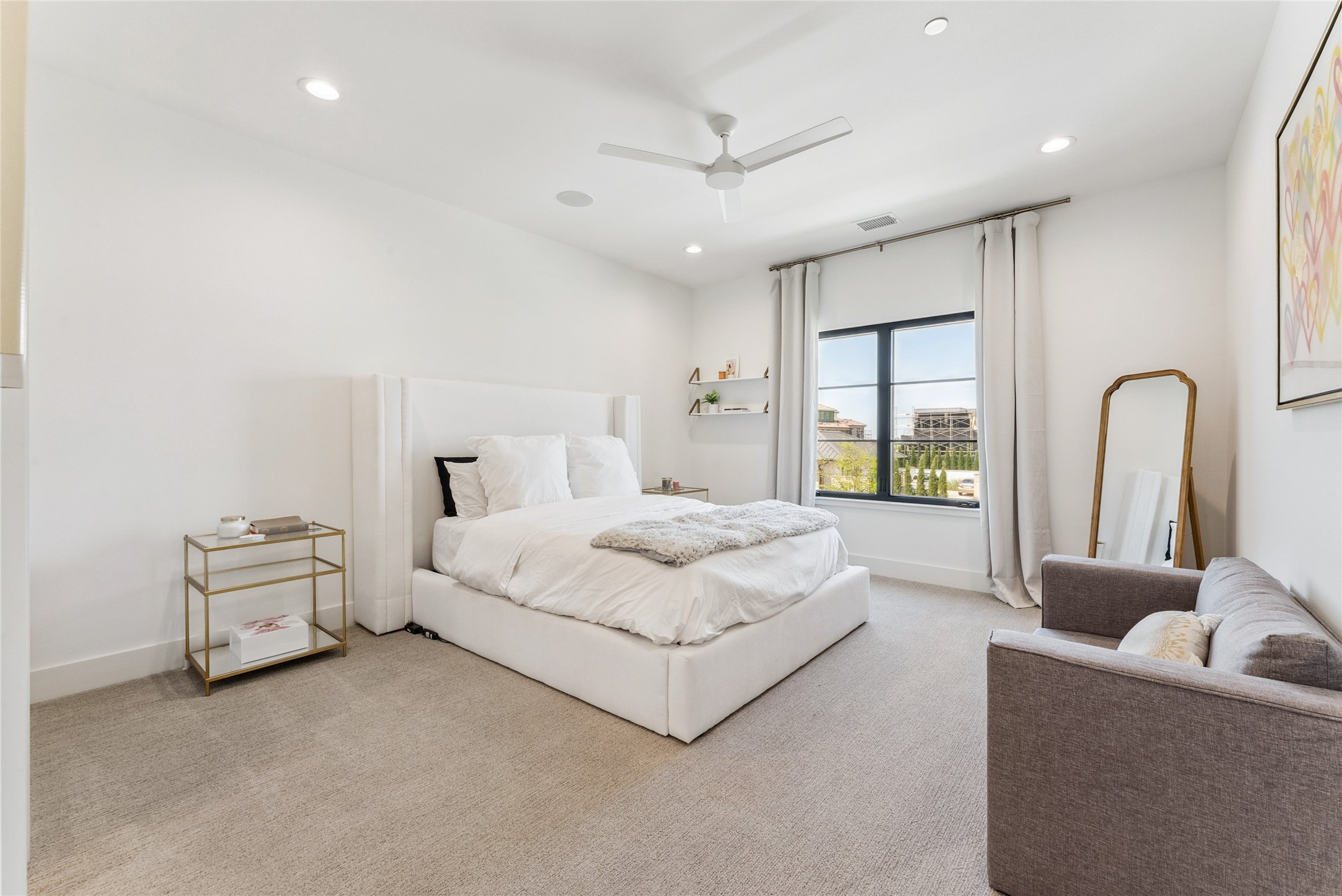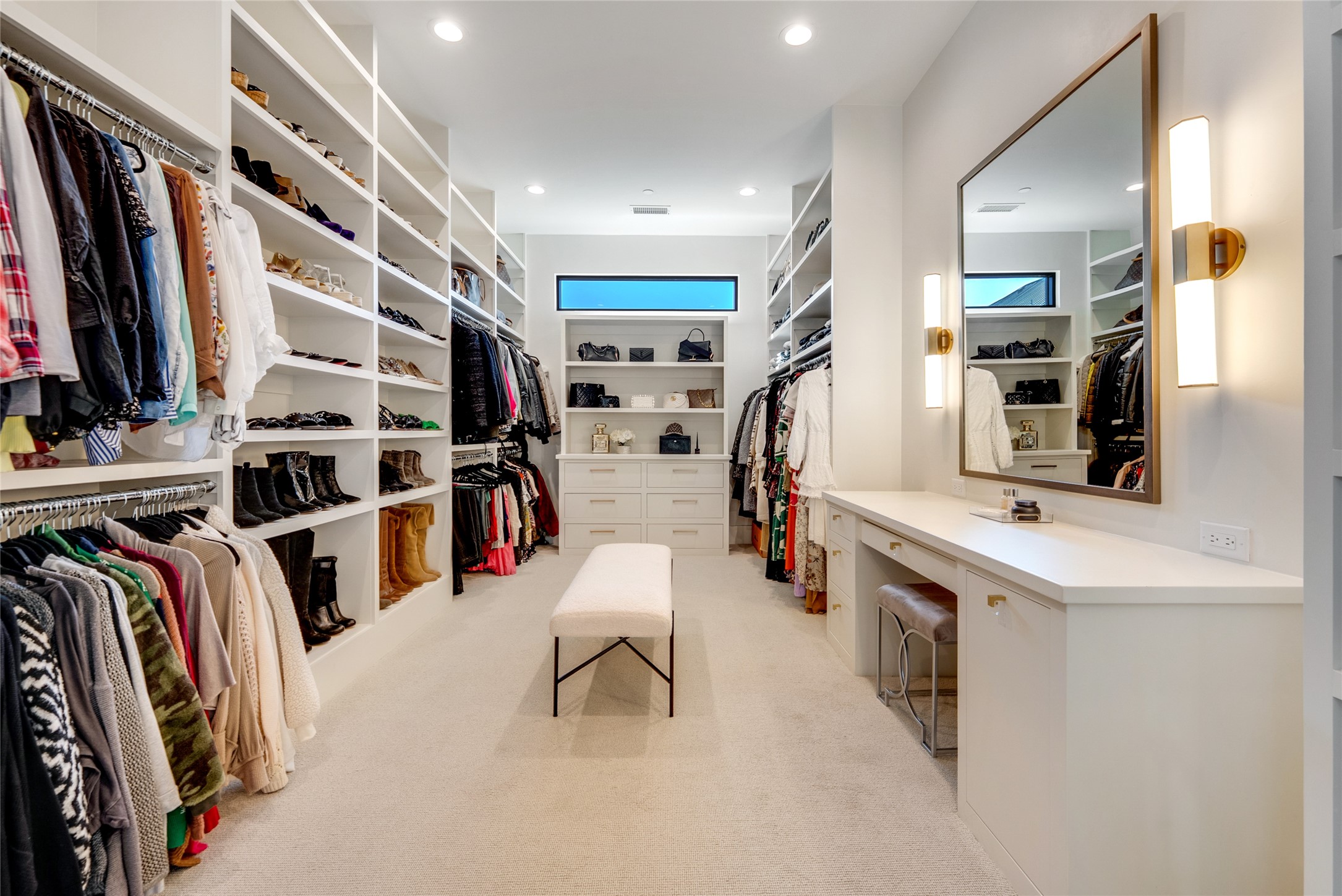 The serene primary suite is a sanctuary of its own, featuring a private coffee bar, spa-like bathroom with oversized shower and soaking tub, and dual custom closets designed for luxurious functionality.