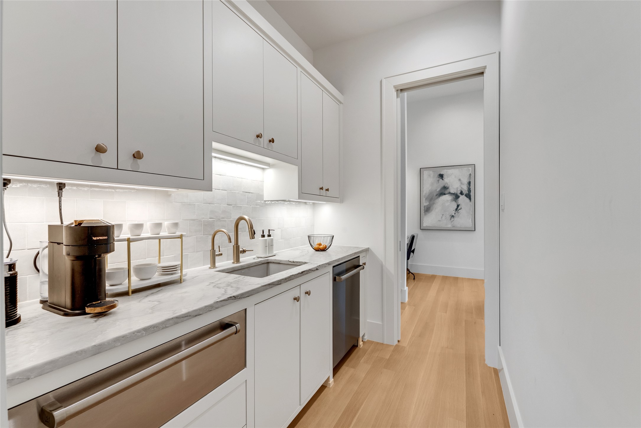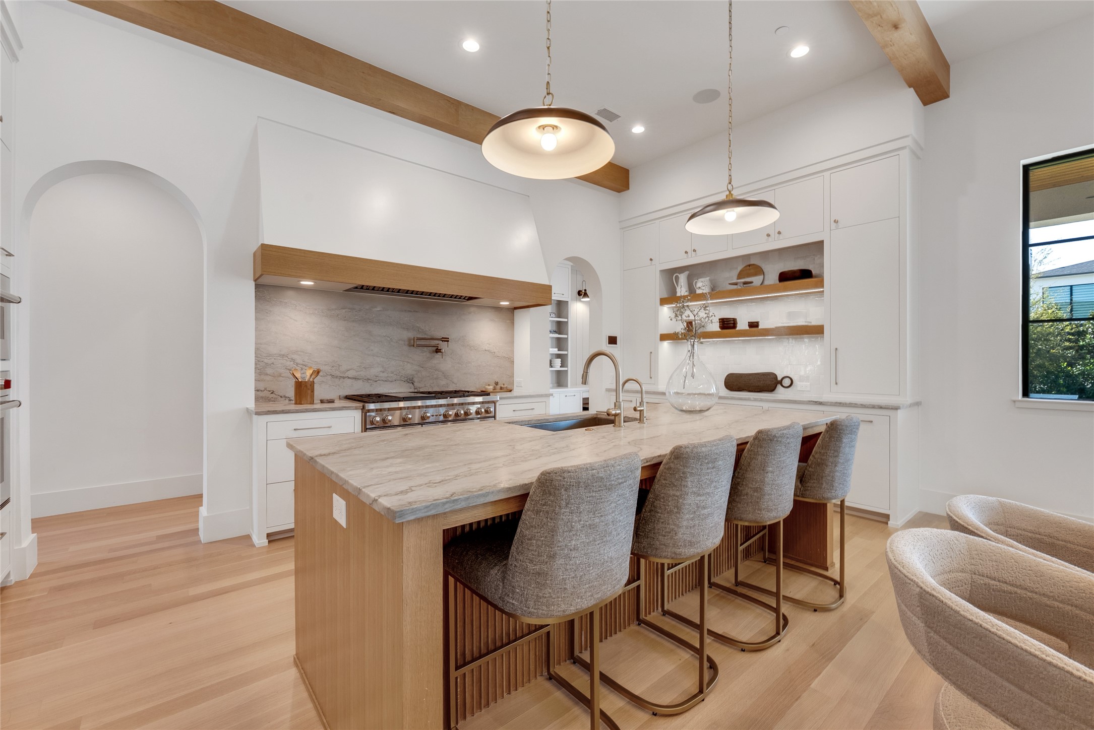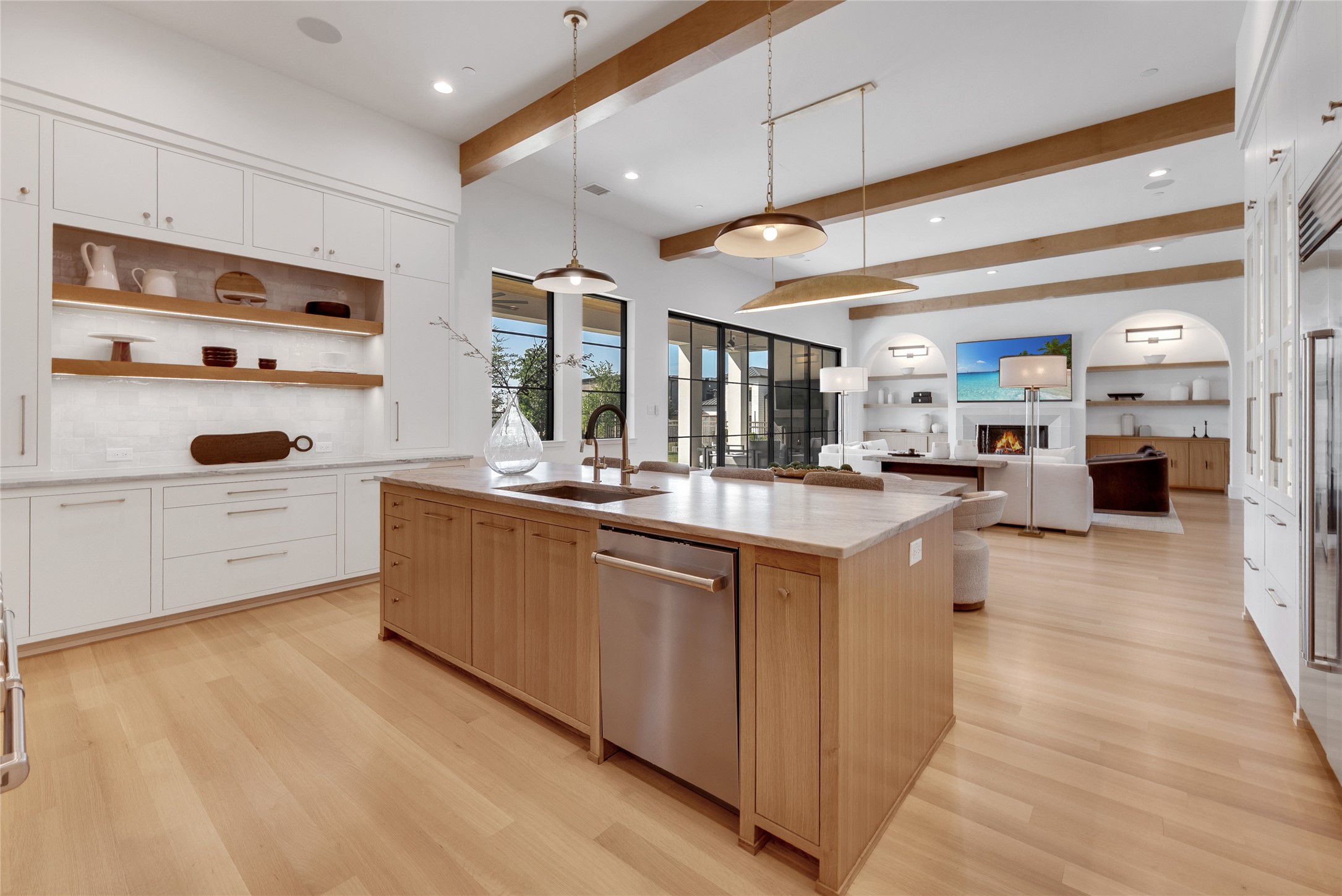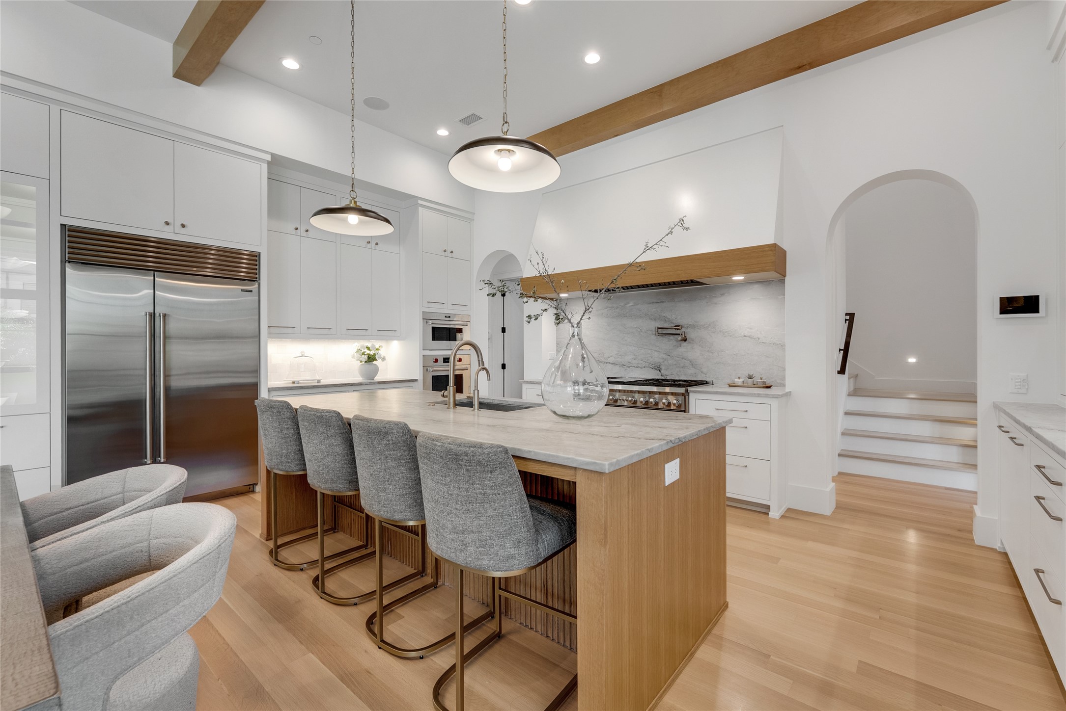 Every inch of this home is custom-crafted with designer finishes and bespoke touches: rift white oak cabinetry and beams, smooth wall finishes, white oak floors, zellige, porcelain and hand painted tiles, with no two rooms alike. The chef's kitchen is a showstopper with quartzite countertops, inset cabinetry, a massive island and venthood, Wolf and Sub-Zero appliances, including a 48" professional range and dual dishwashers, with a prep kitchen perfect for entertaining.