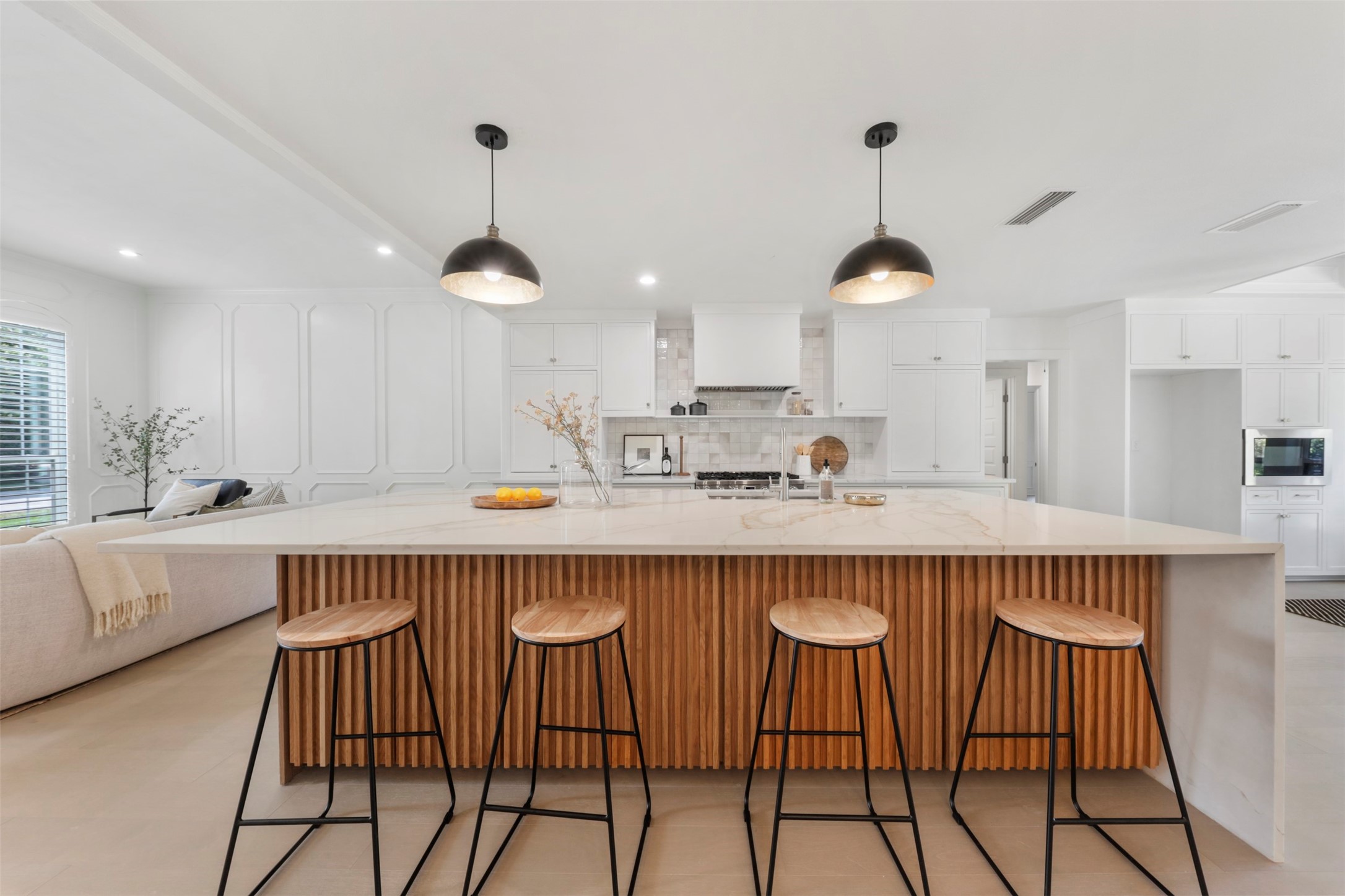 This spacious and stylish 4-bedroom, 3-bathroom single-story home has been beautifully updated with designer finishes throughout. The kitchen is a true showstopper--featuring quartz countertops, a stunning waterfall island, modern backsplash, and stainless steel appliances. It opens to the breakfast area and main living room for easy, open-concept living.
