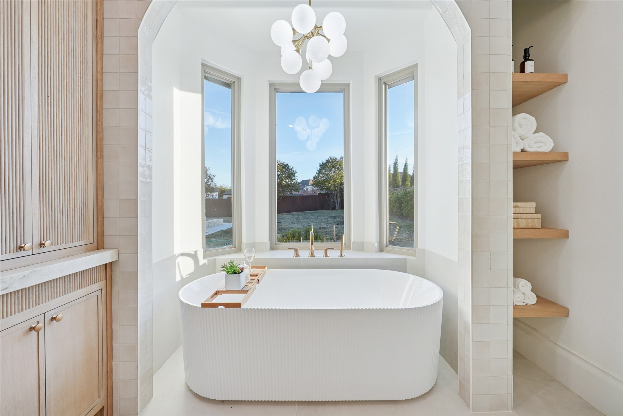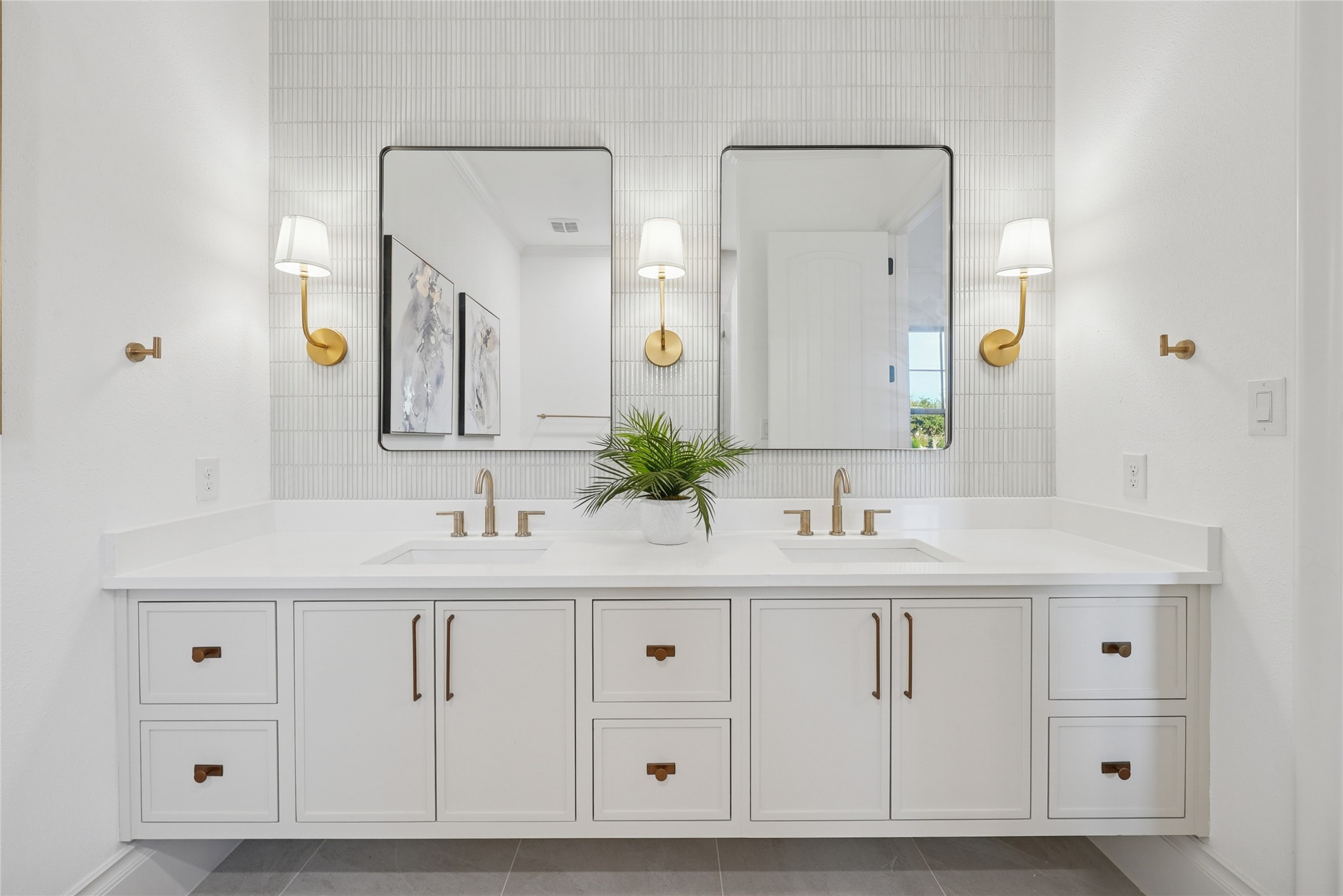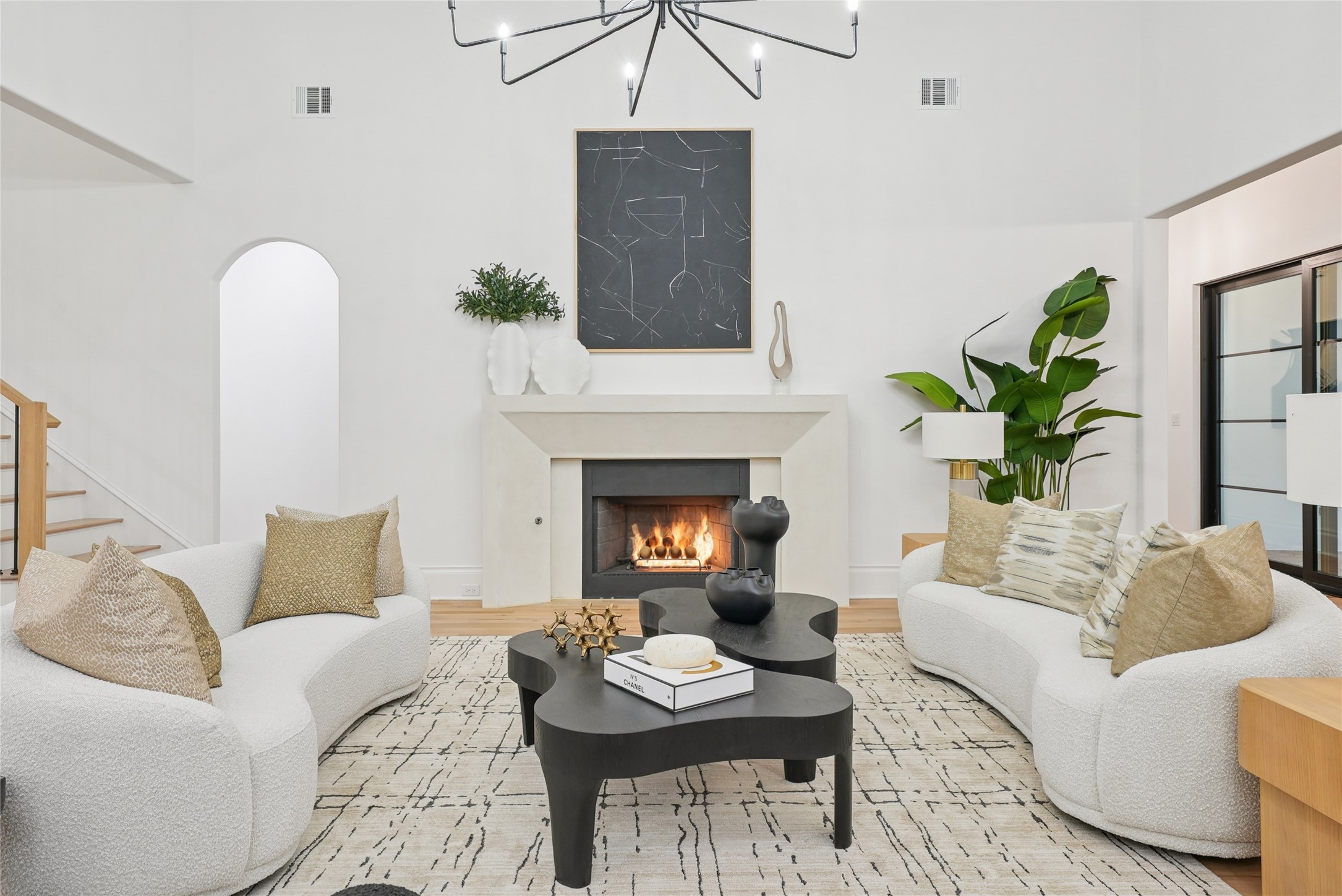 The stucco French Tudor facade makes no apologies -- crisp, substantial, a deliberate rejection of the area's prevailing glass-and-white minimalism. Inside, a groin vault entryway sets the tone: arched, detailed, quietly luxurious. White wood floors anchor expansive light filled rooms, the study dressed in the dramatic depth of Benjamin Moore's *Cheating Heart* while classic stones bring enduring patina to baths and surfaces.