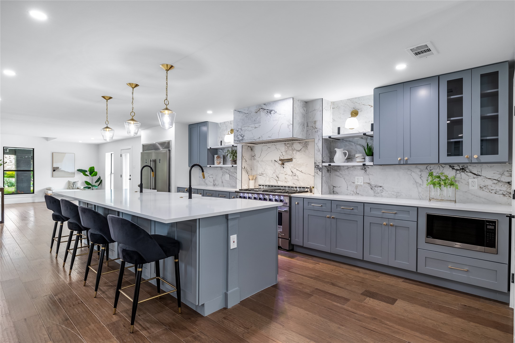 A stunning reimagined home nestled on a third of an acre in the highly coveted neighborhood of Prestonwood. The unique exterior elevation features white painted brick and extended driveway. Walk in through the oversized custom pivot door to a light & bright open floor plan. Designer finishes at every turn include accent walls, ceiling and fireplace details marble, porcelain, and quartz countertops. The chef's kitchen features a large pantry, new appliances, oversized island, feature walls, new cabinets, open shelving & custom vent-hood.