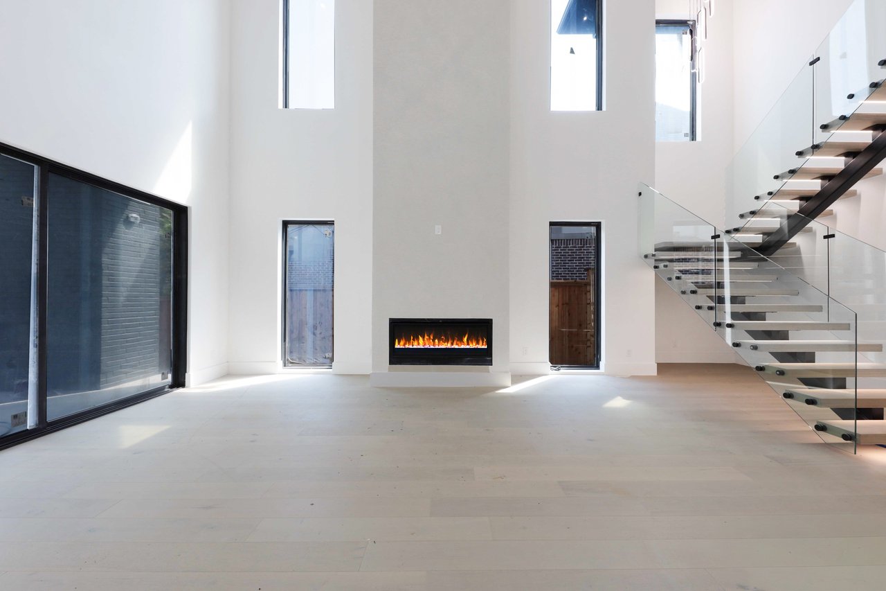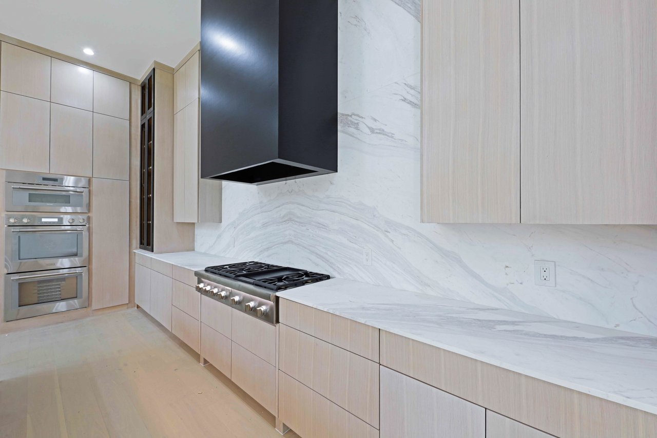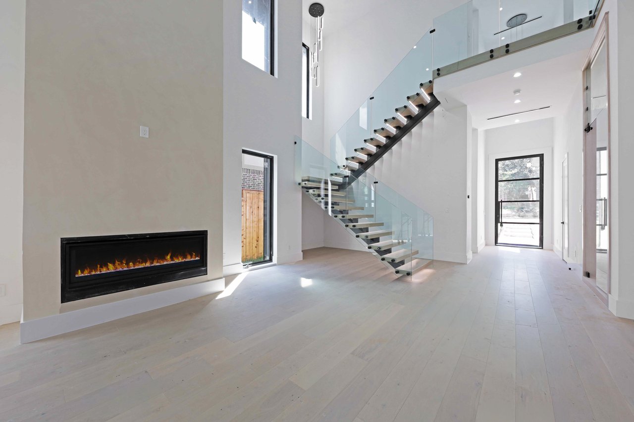Inside, soaring 22-foot ceilings frame a dramatic floor-to-ceiling Venetian plaster fireplace, while a floating glass staircase with motion LED accents creates an architectural centerpiece. The chef’s kitchen is anchored by a 12-foot island, clad in marble slab waterfall counters and backsplash, paired with Thermador panel-ready appliances. A full Bosch-equipped back kitchen and pantry elevate function without compromising design.