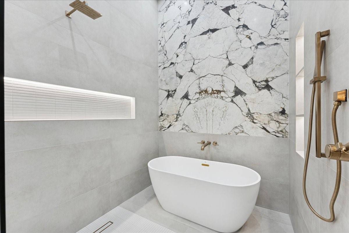 Highlights include a glass-enclosed wine display accented in oak, a wet bar connecting the media and game rooms, and spa-like bathrooms with thoughtfully curated stonework. The first-floor primary suite offers a serene retreat with a spa bath and custom rift oak cabinetry. A secondary guest bedroom is also conveniently located on the first floor, with a moody guest bath attached. Upstairs, three en-suite bedrooms are complemented by a media room, game room, and flexible space for a gym, studio, or office.