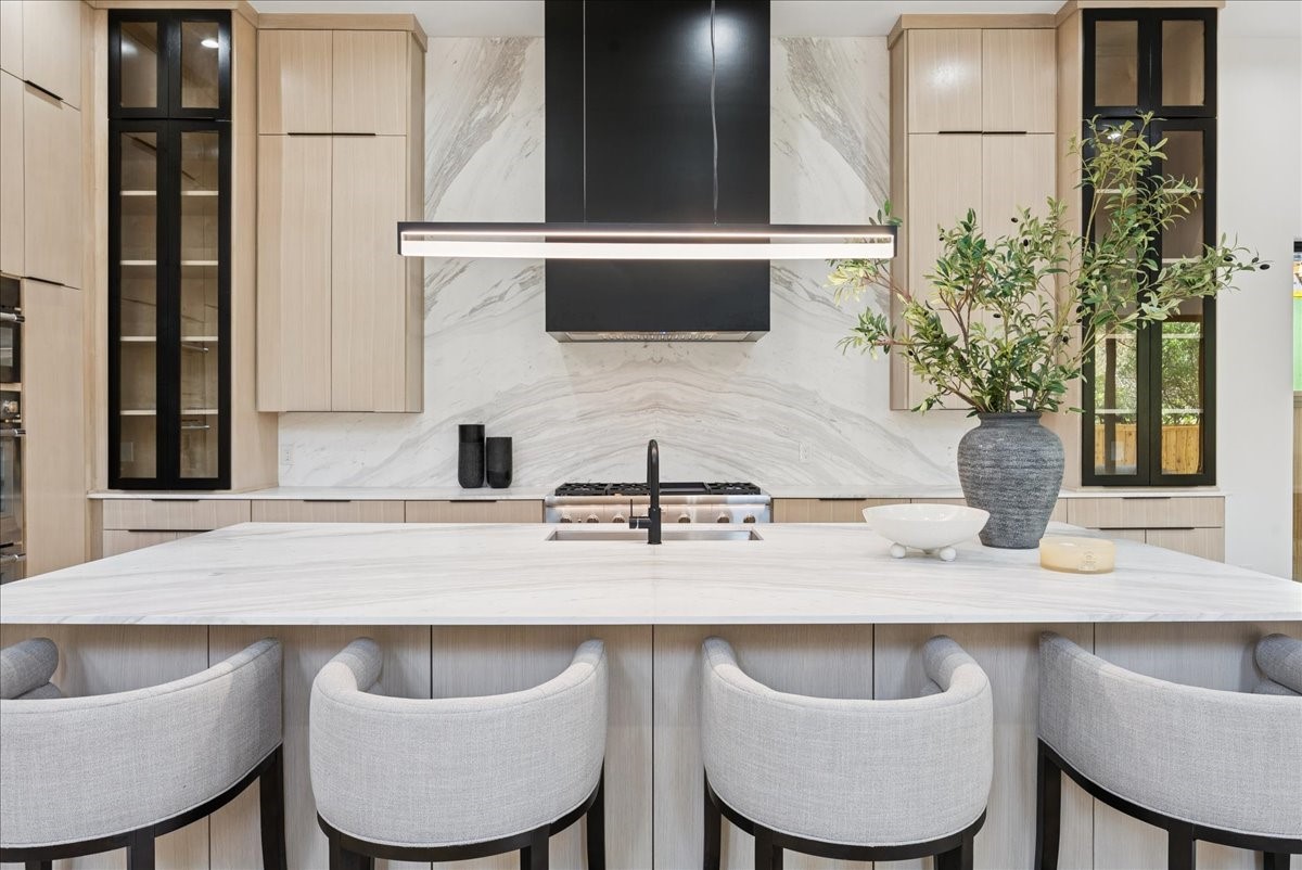 Inside, soaring 22-foot ceilings frame a Venetian plaster fireplace, while a floating glass staircase with motion LED accents serves as an architectural centerpiece. The chef's kitchen is anchored by a 12-foot waterfall island, paired with Thermador panel-ready appliances and a Bosch-equipped back kitchen for added function.