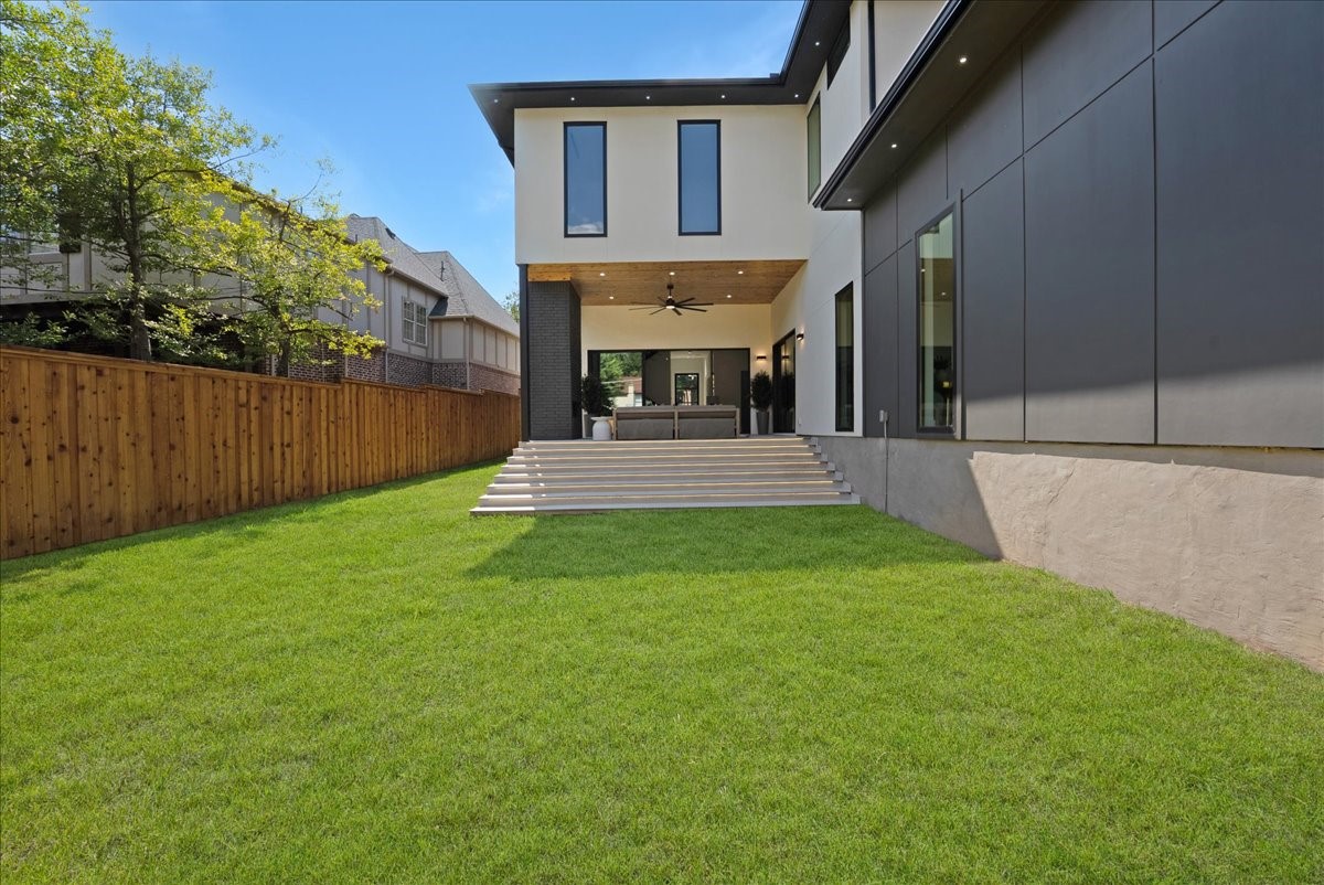 Expansive glass sliders dissolve the boundary between indoors and out, opening to a sunken backyard oasis with a fireplace, paver steps, and multi-level design that captures a California lifestyle in the heart of Dallas.