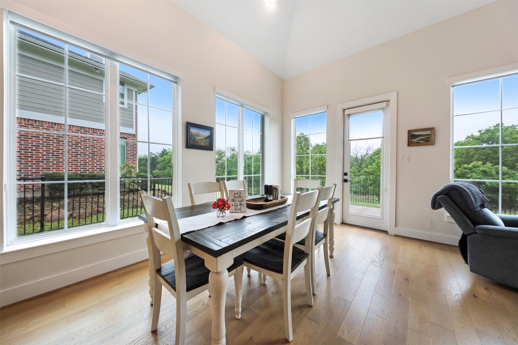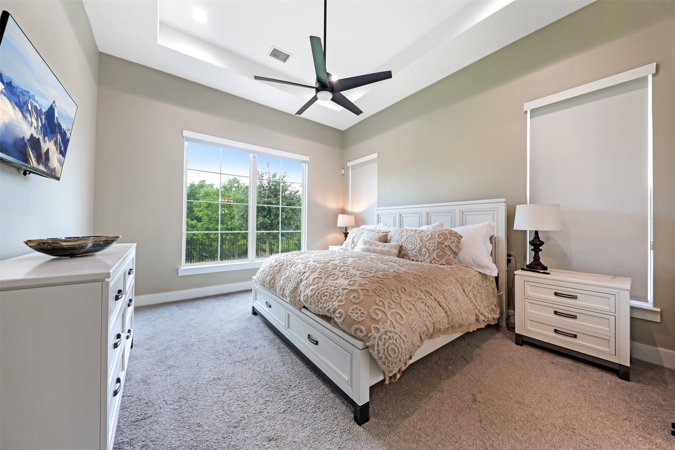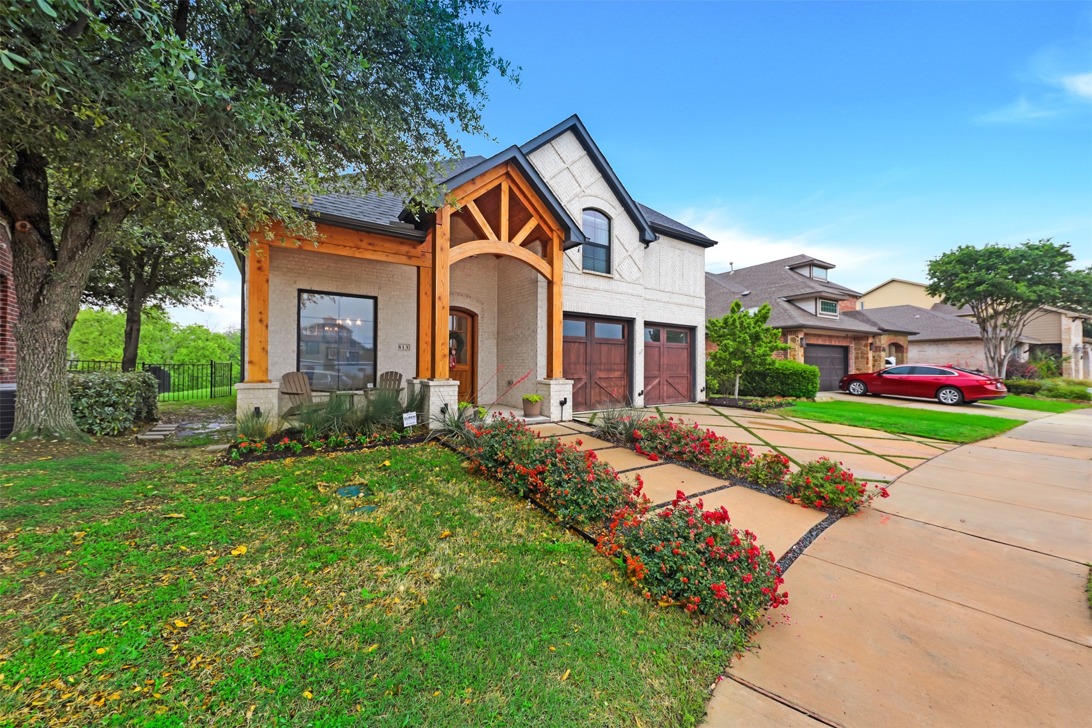 his 3-bedroom, 2.5-bath home is directly across from the Savannah community lake and backs to a greenbelt, offering open water views and a direct connection to the surrounding landscape. The exterior features a decorative driveway, cedar garage doors, and a spacious timber front porch with an oversized arched mahogany front door.