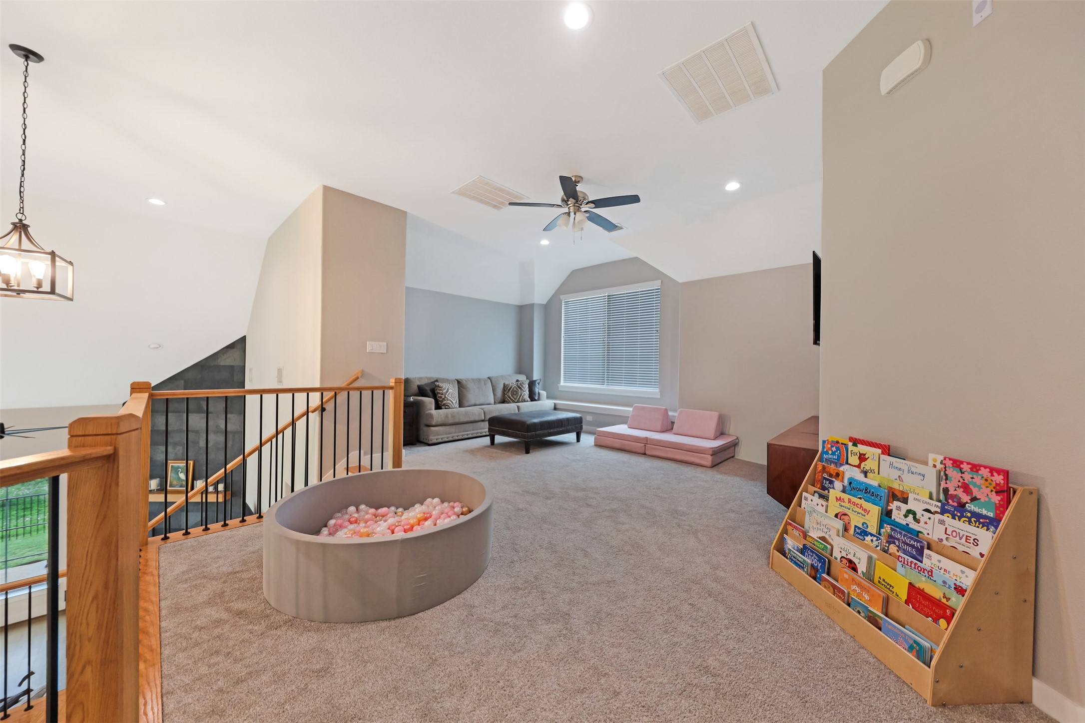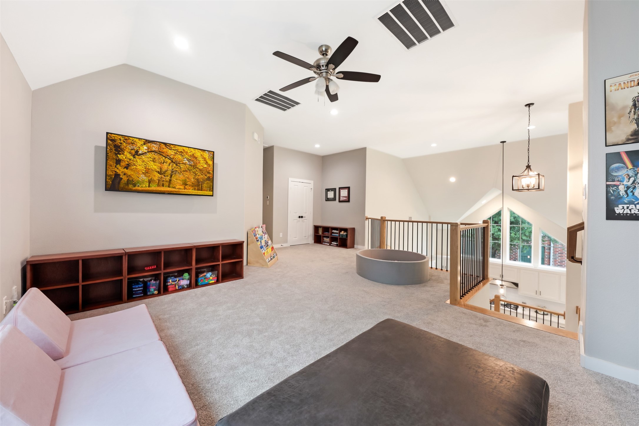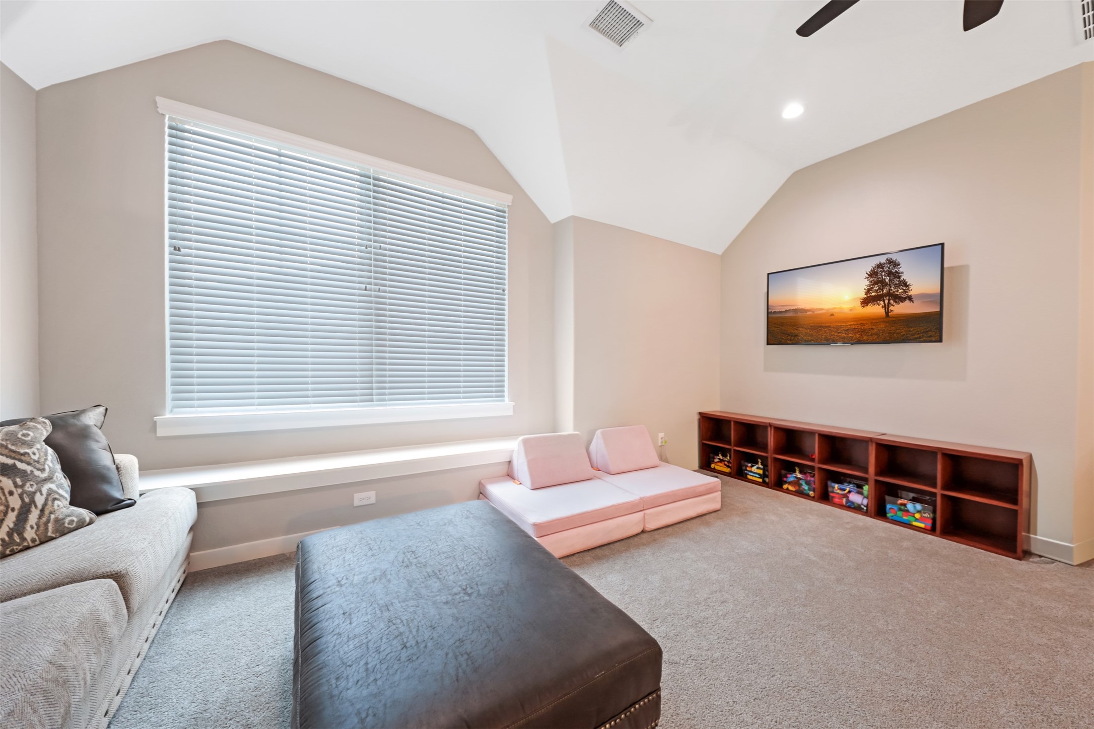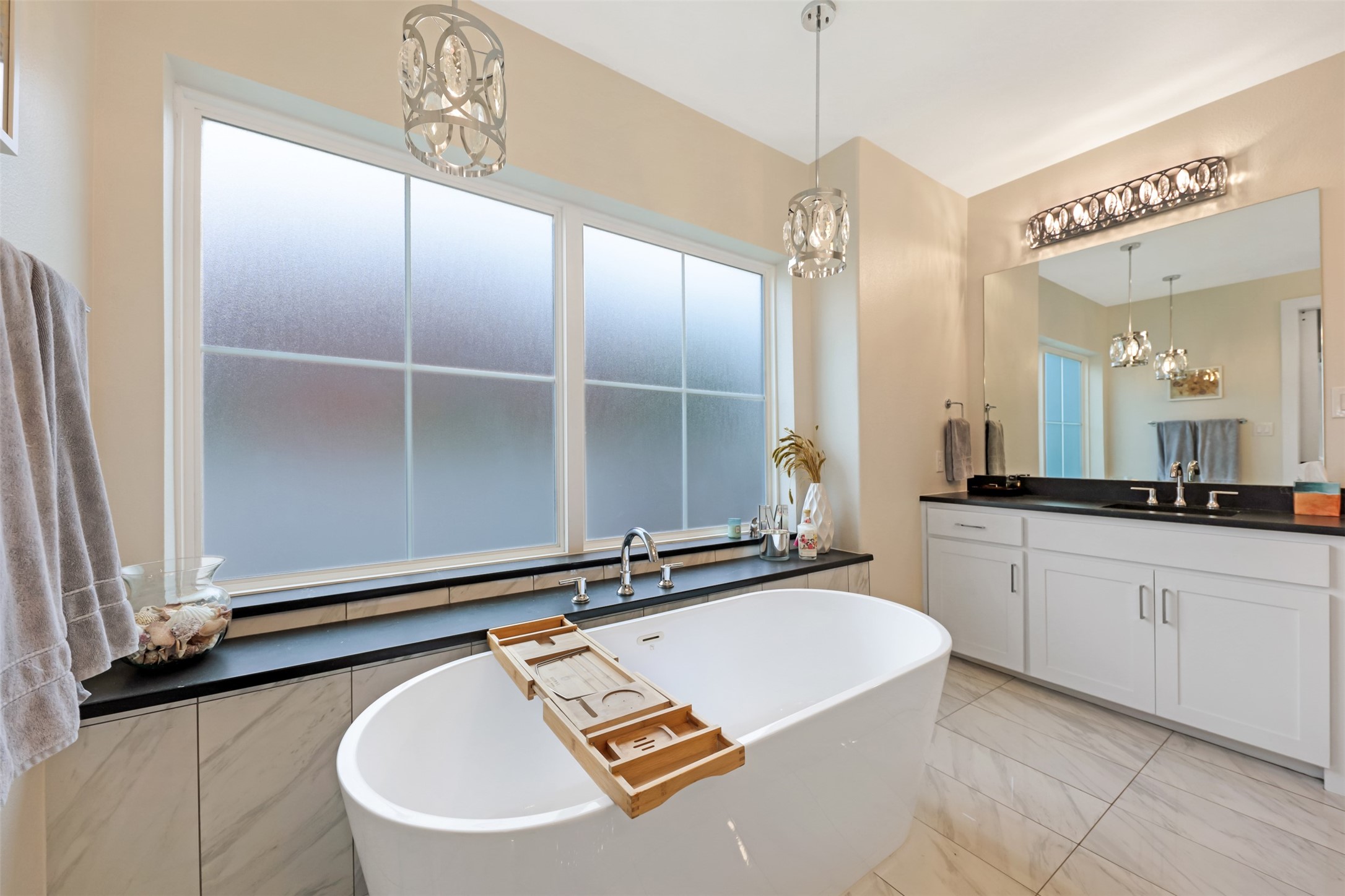his 3-bedroom, 2.5-bath home is directly across from the Savannah community lake and backs to a greenbelt, offering open water views and a direct connection to the surrounding landscape. The exterior features a decorative driveway, cedar garage doors, and a spacious timber front porch with an oversized arched mahogany front door.