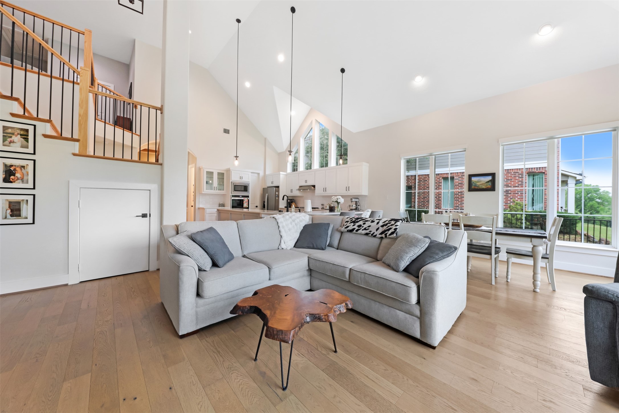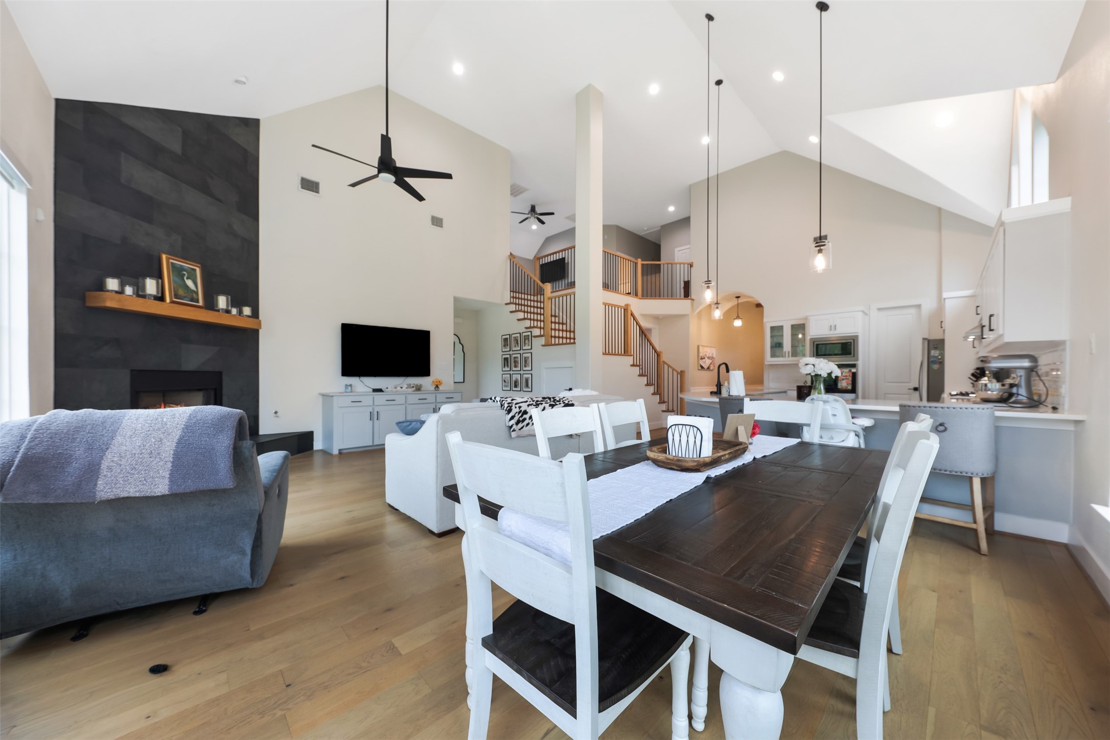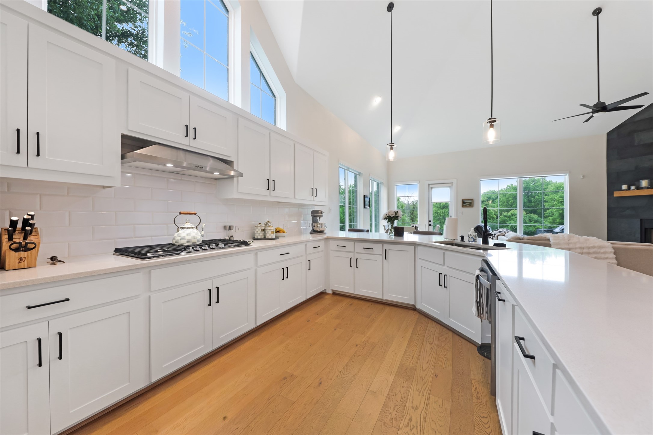 Inside, the open floorplan and large windows allow for an abundance of natural light to flow throughout. White oak flooring runs through the main living areas and stairs. The open dining area showcases a groin vault ceiling with oak beams. The living room features vaulted ceilings and a floor-to-ceiling tiled fireplace. The kitchen is designed with a U-shaped layout, peninsula seating, quartz countertops with a waterfall edge, and stainless steel appliances including a double oven and gas range.