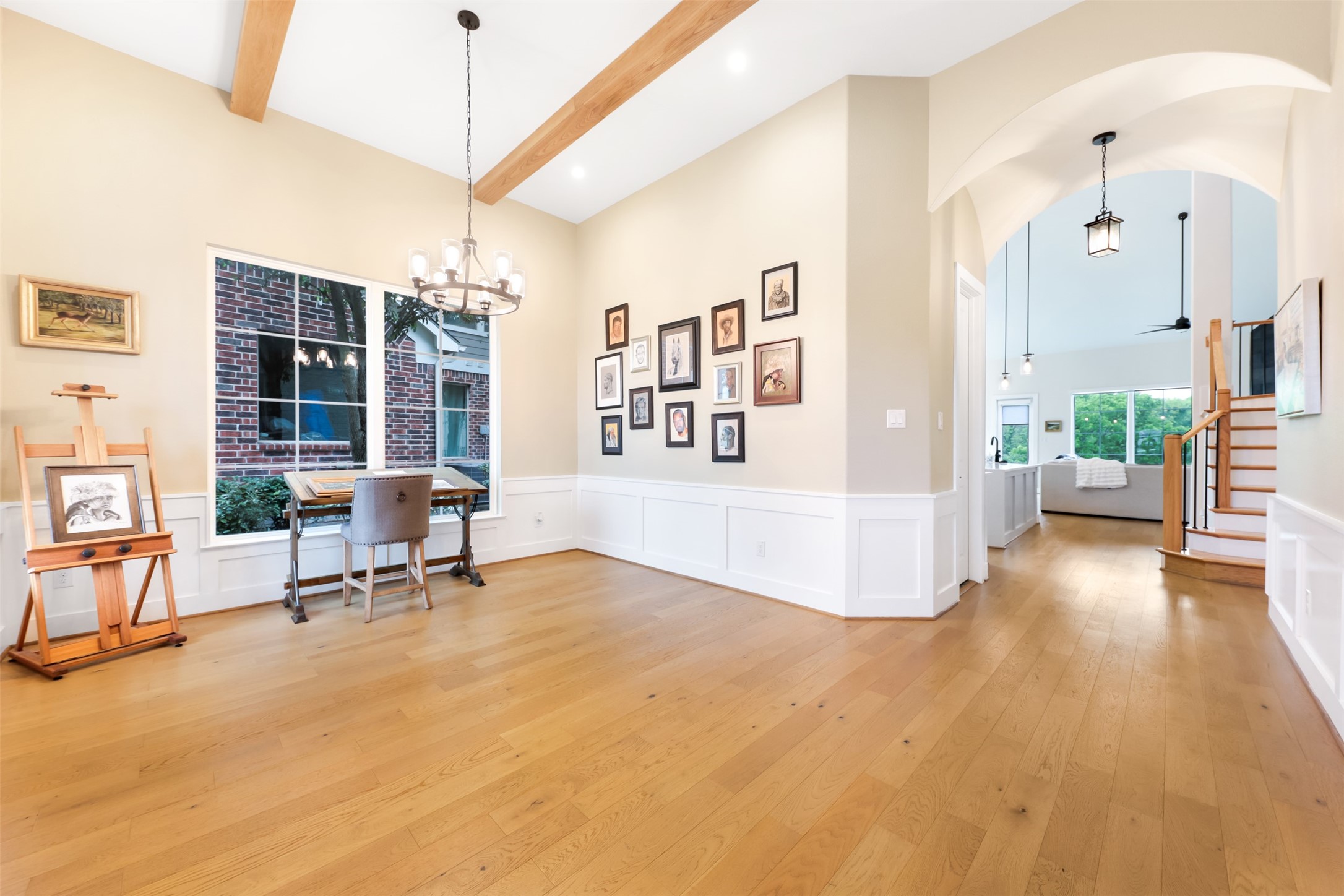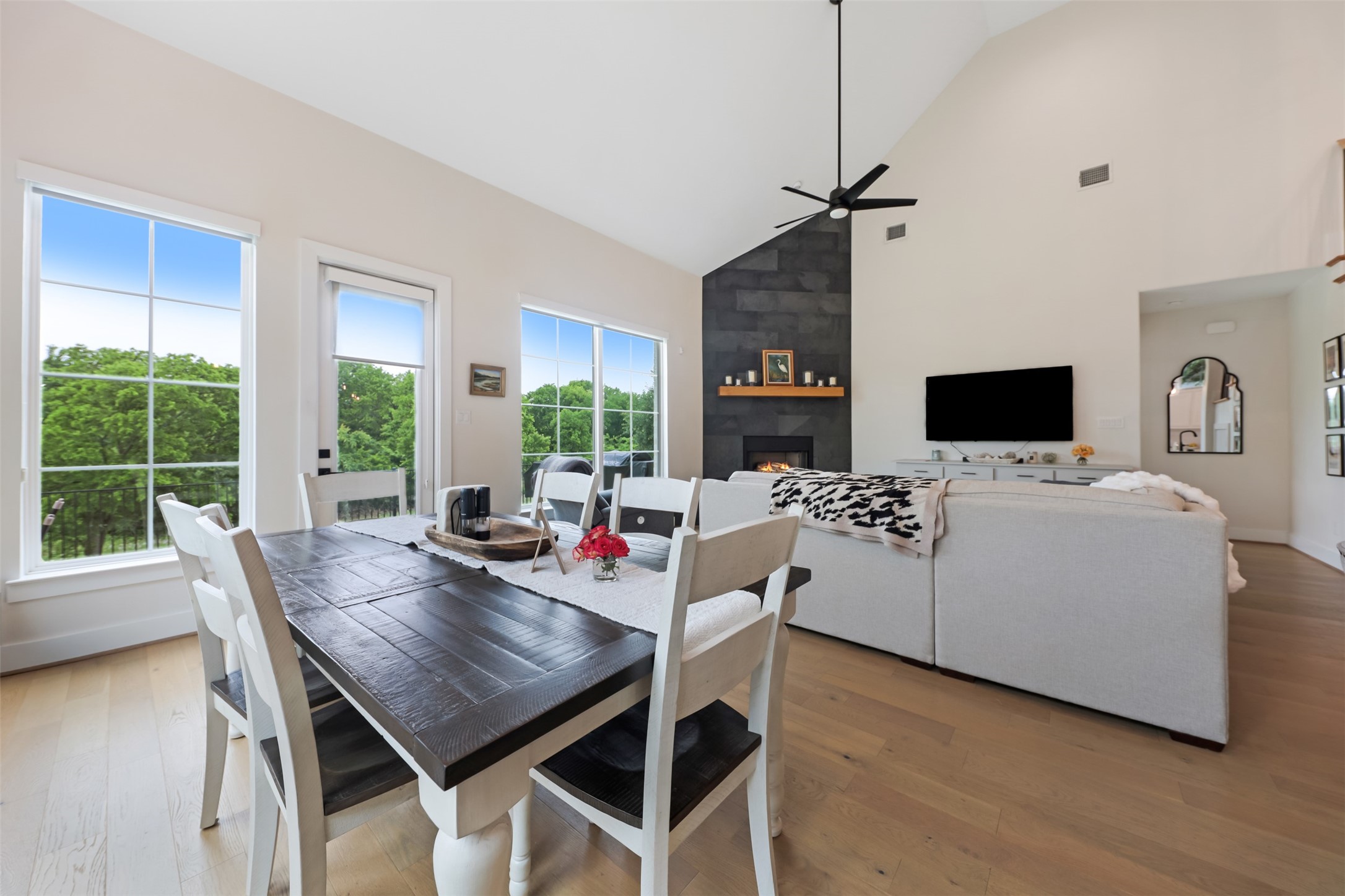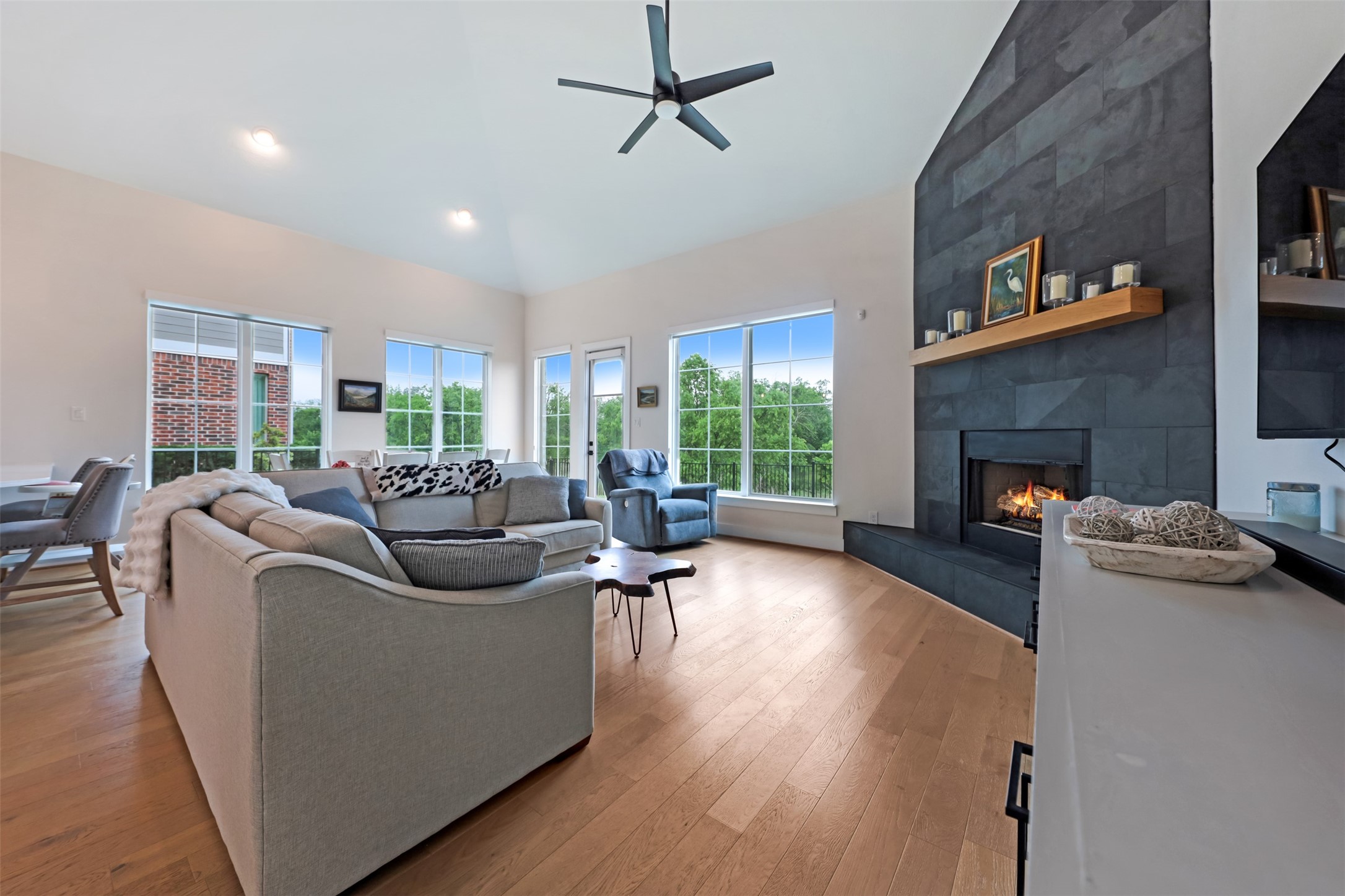 Inside, the open floorplan and large windows allow for an abundance of natural light to flow throughout. White oak flooring runs through the main living areas and stairs. The open dining area showcases a groin vault ceiling with oak beams. The living room features vaulted ceilings and a floor-to-ceiling tiled fireplace. The kitchen is designed with a U-shaped layout, peninsula seating, quartz countertops with a waterfall edge, and stainless steel appliances including a double oven and gas range.